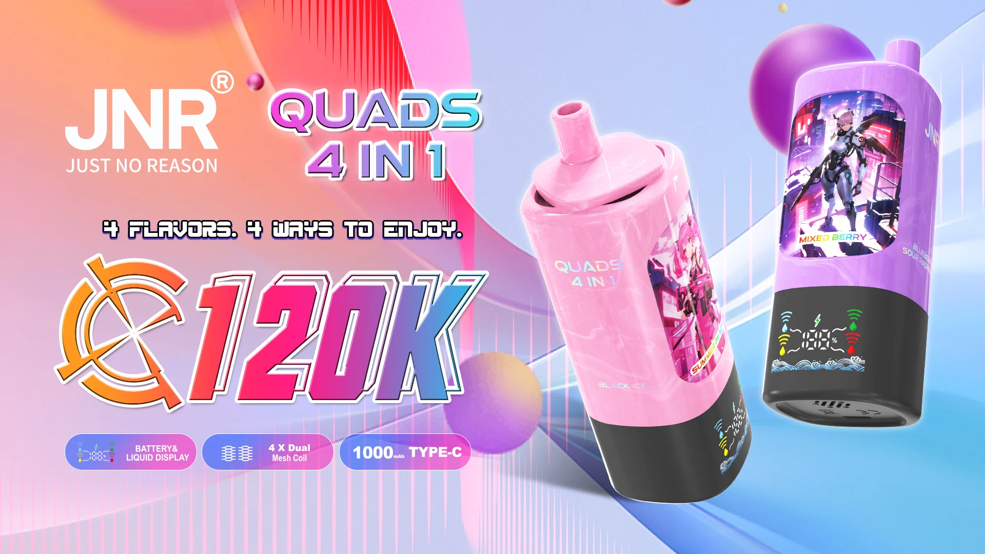 El JNR Quads 4-in-1 no solo destaca por su potencia, sino por su diseño visual revolucionario que fusiona el arte del anime con la estética cyberpunk. Cada dispositivo es una pieza de colección que captura la esencia del futuro.