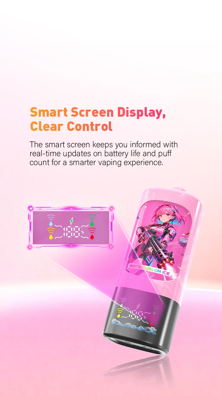 Diseñado específicamente para cumplir con los estándares de la UE, cuenta con una concentración de nicotina del 2% (compatible con TPD), una pantalla inteligente para el monitoreo en tiempo real de la batería y el estado de vapeo, y carga rápida mediante puerto Tipo-C. Es la solución ideal tanto para consumidores exigentes como para distribuidores que buscan un producto líder en innovación y eficiencia.