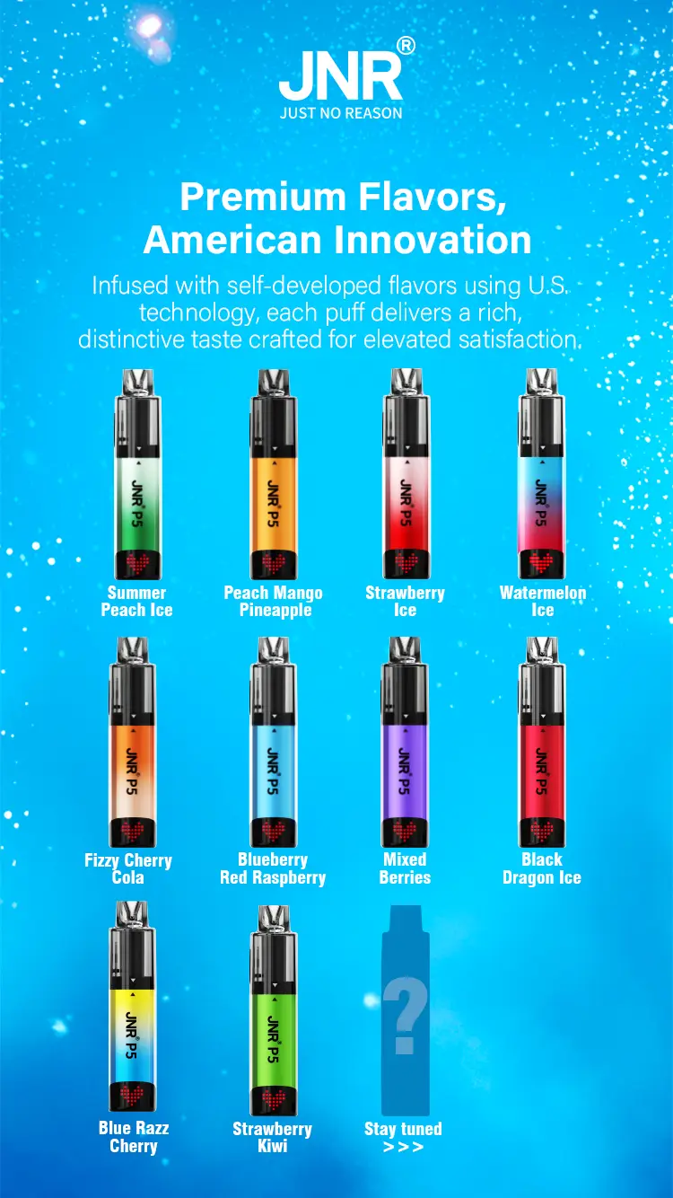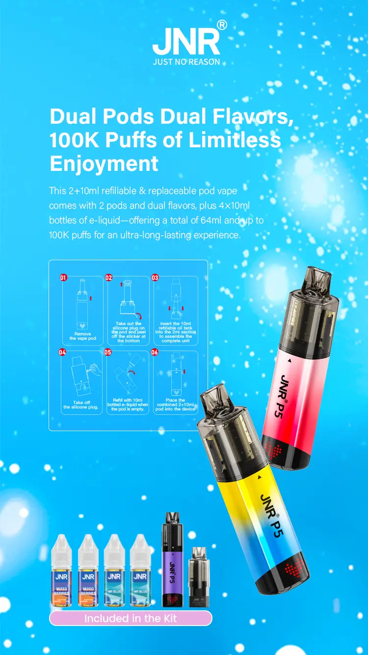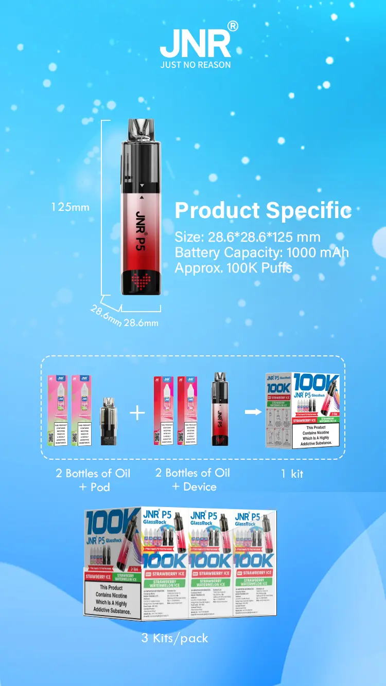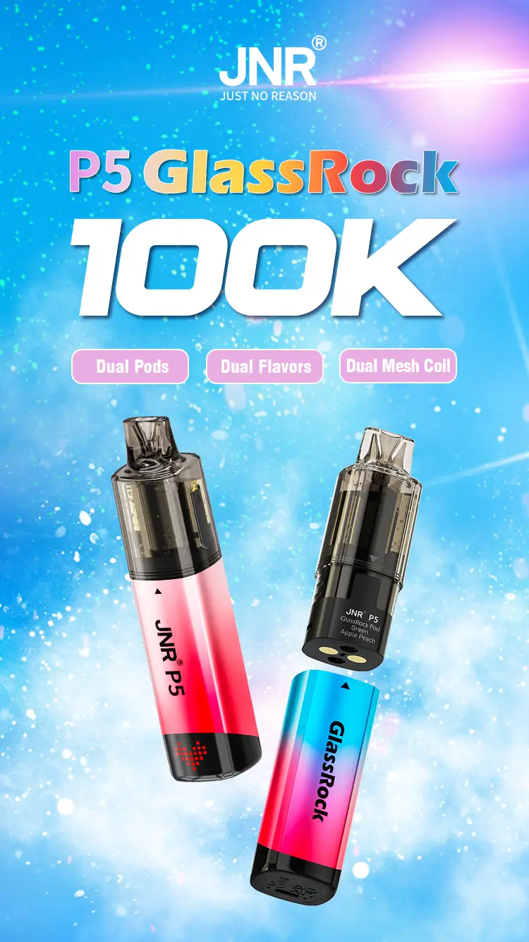 The JNR P5 GlassRock 100K is a vape kit made to last and be easy to use. It comes with 64ml of ready-to-use e-liquid and dual mesh coils for strong and smooth flavour. The system is both refillable and replaceable, giving you lots of options. In the box, you get two 2ml prefilled pods, two 10ml refill containers, and four 10ml bottles, enough for up to 100,000 puffs.